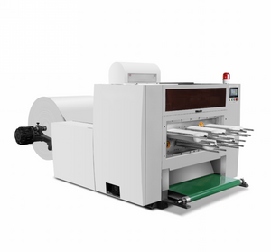 Cuts printed paper into cup fan shapes.